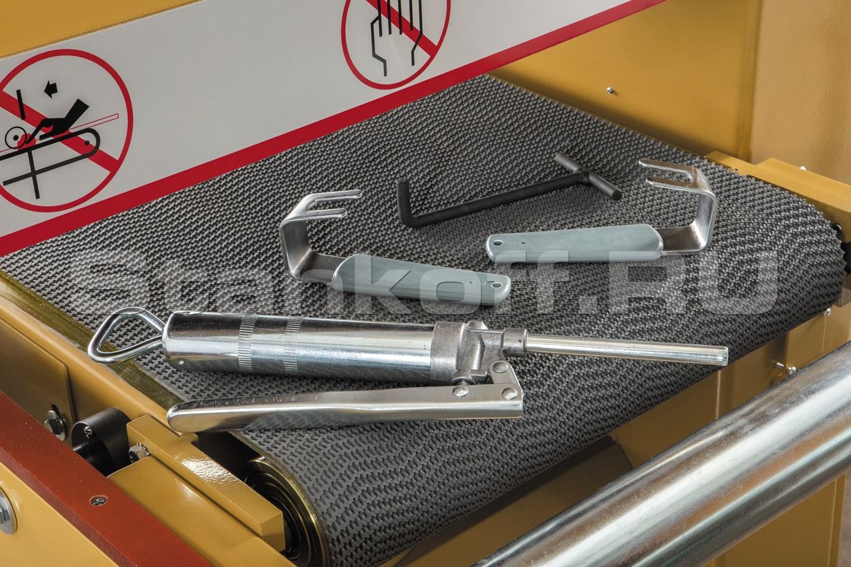 Рабочий стол регулируется по высоте, за счет чего меняется просвет до ленты и, соответственно, толщина деталей, получаемая после калибрования. Подача производится на прорезиненной транспортерной ленте с приводом от вспомогательного двигателя. Скорость подачи меняется переустановкой звездочек цепной передачи. Шлифовальный узел с консольным расположением позволяет обрабатывать широкие заготовки в два прохода. Для их размещения предусмотрен выдвижной расширитель на мощных стальных направляющих. Продольные роликовые удлинители выполнены не складными, а съемными – они востребованы почти всегда, и часто убирать/ставить их не требуется.