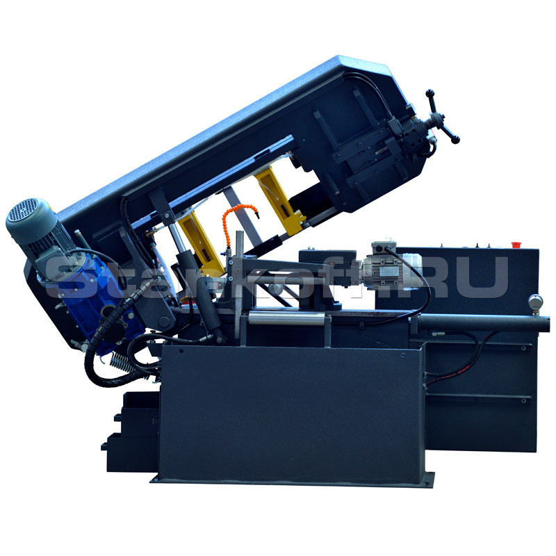 - Конструкция станка имеет отличительные особенности в зависимости от назначения модели (второй гидроцилиндр на опускание пильной рамы, гидравлический привод перемещения губок тисков в зависимости от положения пильной рамы, дополнительные вертикальные направляющие, автоматическая регулировка высоты подъёма пильной рамы, педаль оператора и др.).