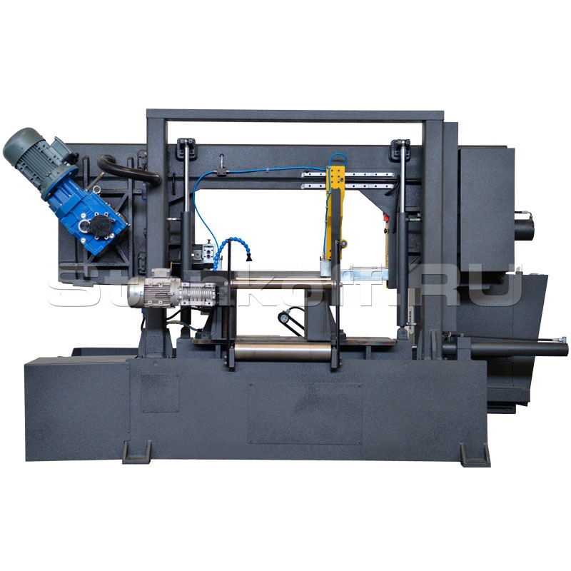 Основное преимущество станков двухколонного типа над маятниковыми - это повышенная жёсткость конструкции. Пильная рама у таких станков перемещается по двум направляющим колоннам, расположенным с двух сторон зоны обработки. Такая жёсткая схема обеспечивает значительное снижение вибраций в процессе резания, что в итоге позволяет увеличить производительность и положительно сказывается как на стойкости ленточной пилы, так и на долговечности всего станка. Станок оснащён линейкой и конечником.