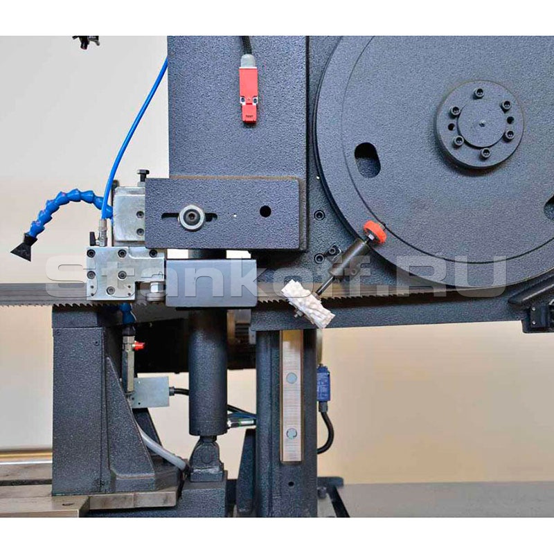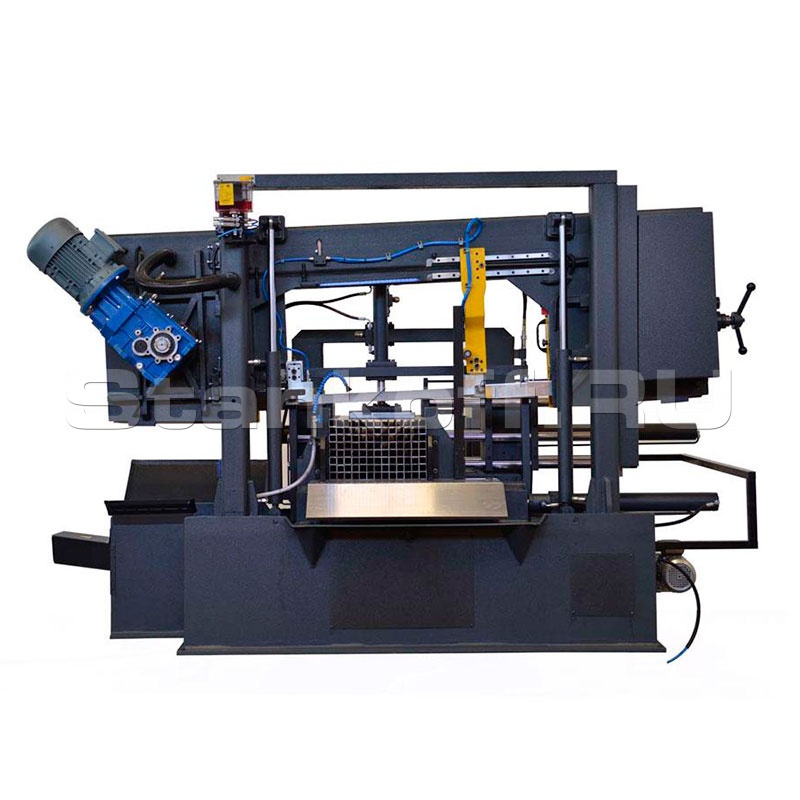 Промышленный автоматический ленточный станок двухколонного типа подходит для распила заготовок со сплошным сечением, цельнометаллических балок. Программный контроллер управления с памятью на 10 программ резки. Модифицированная панель управления с удобным расположением. Модель оснащена гидроцилиндром подъёма пильной рамы, двойными гидравлическими зажимными тисками и плавной регулировкой хода пильного полотна. Процесс резки осуществляется с поворотом механизма под разными углами. Натяжение полотна осуществляется вручную.