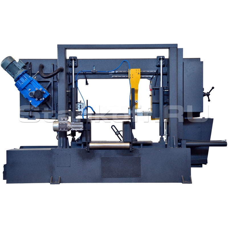Основное преимущество станков двухколонного типа над маятниковыми - повышенная жёсткость конструкции. Пильная рама станка перемещается по двум направляющим колоннам, расположенным с двух сторон зоны обработки. Такая жёсткая схема обеспечивает значительное снижение вибраций в процессе резания, что в итоге позволяет увеличить производительность и положительно сказывается как на стойкости ленточной пилы, так и на долговечности всего станка. Станок оснащён линейкой и конечником.