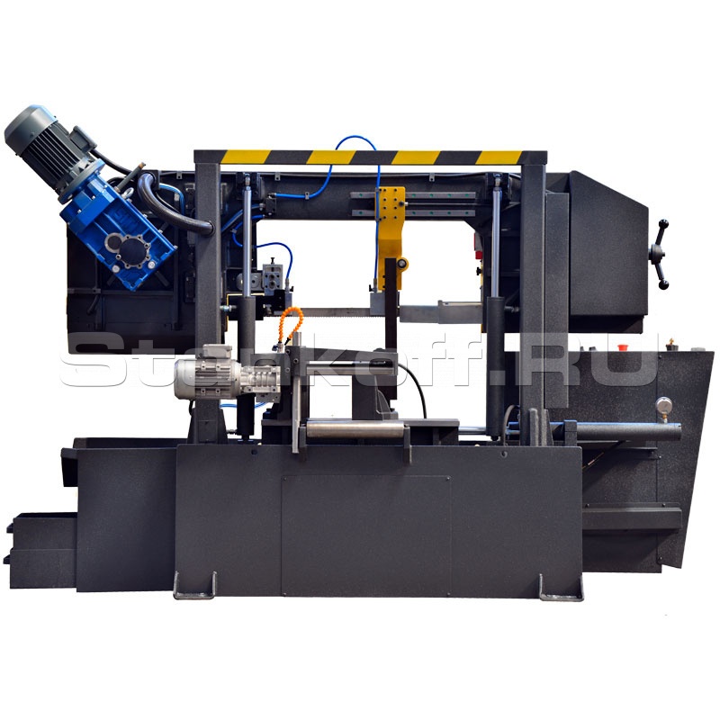 - Конструкция станка имеет отличительные особенности в зависимости от назначения модели (второй гидроцилиндр на опускание пильной рамы, гидравлический привод перемещения губок тисков в зависимости от положения пильной рамы, дополнительные вертикальные направляющие, автоматическая регулировка высоты подъёма пильной рамы, педаль оператора и др.).