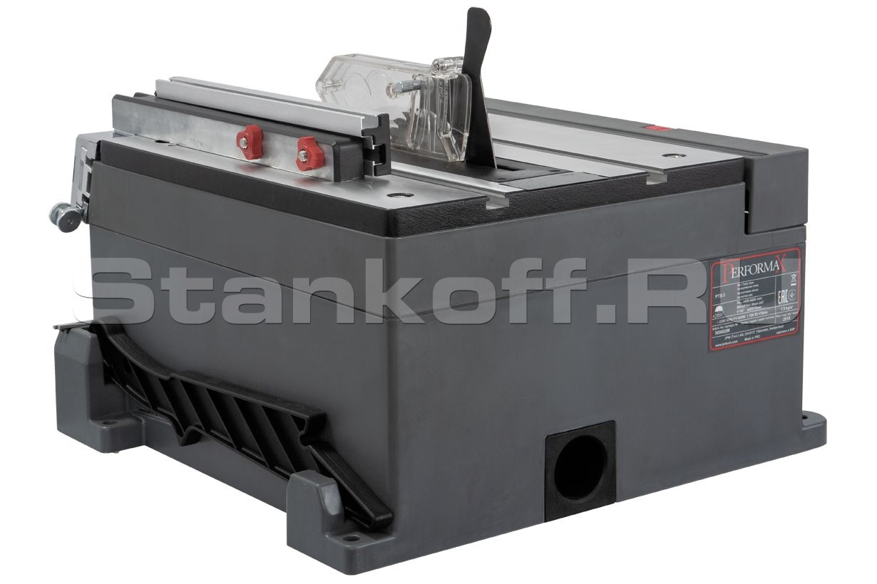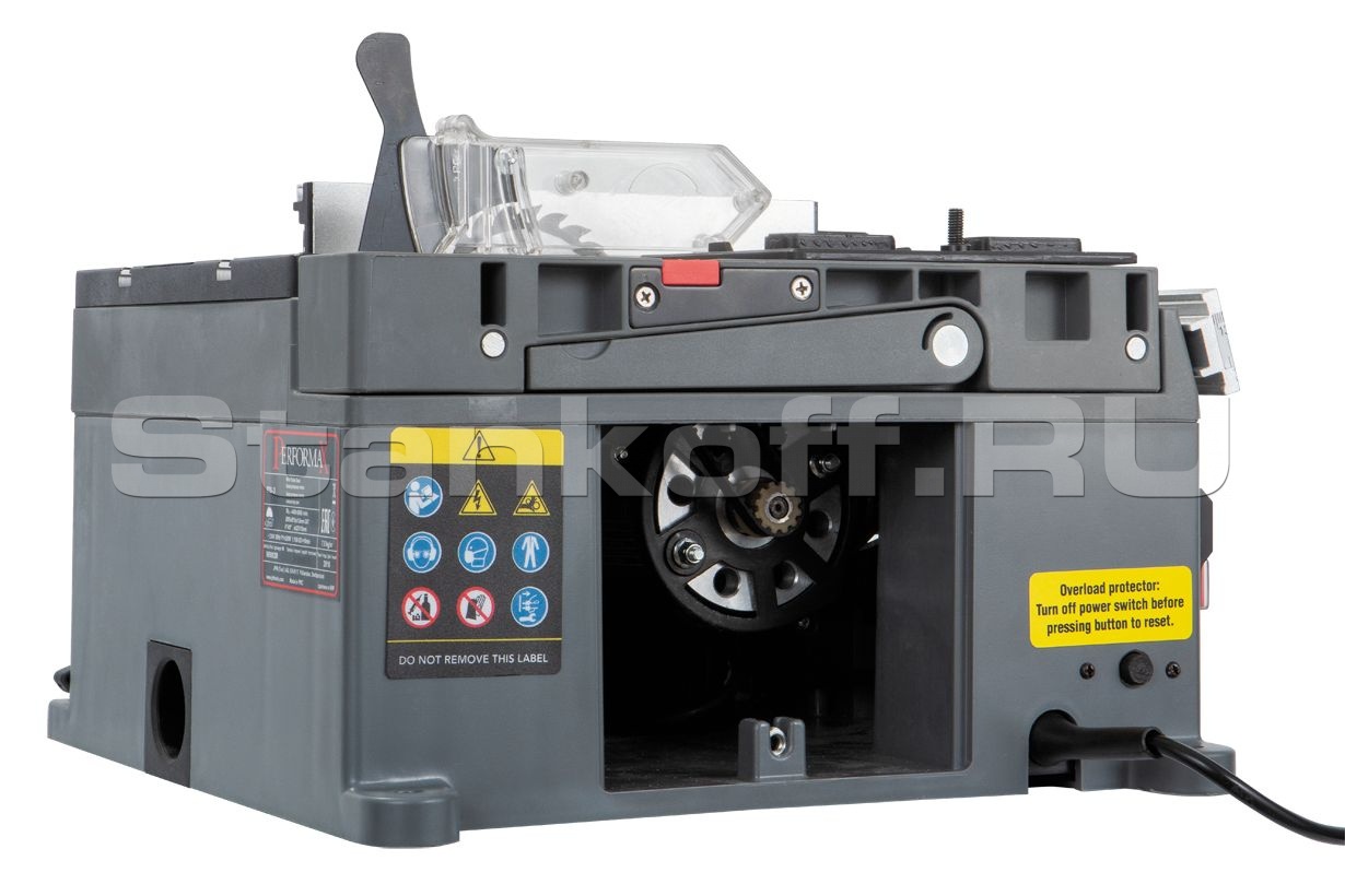 Пильный диск регулируется по высоте и наклону, настройка производится рукоятки с фронтальной стороны. Привод шпинделя ременный от тяговитого коллекторного двигателя с возможностью изменения частоты вращения. Рукоятка электронного регулятора и справочная таблица рекомендованных для разных материалов значений расположена рядом с магнитным выключателем. Диск заменяют с верхней стороны стола после извлечения вкладыша, под ним же стопор, позволяющий снять или установить расклинивающий нож с кожухом.