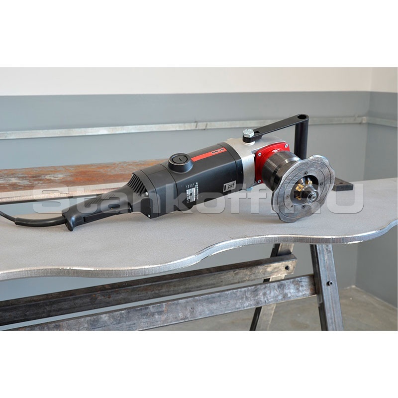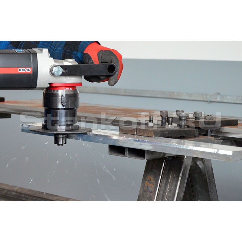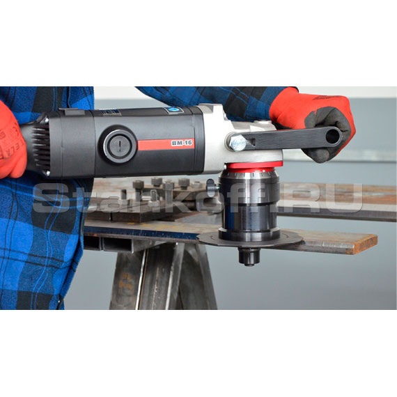 Портативная ручная машина ВМ-16 предназначена для снятия фаски на листах, трубах, криволинейных поверхностях, в отверстиях. Работает по стали, алюминиевым сплавам, латуни различным пластикам. В зависимости от выбранной фрезерной головки, машина может снимать фаску под углами 22.5°, 30°, 37.5°, 45°, 55° и 60° на материале толщиной от 1,5 мм с максимальной шириной фаски от 16 мм. Фрезерная головка оснащена 5 сменными высокостойкими твердосплавными пластинами. Фрезерная головка, предназначенная для скругления кромки может оснащаться пластинами с радиусами обработки R3, 4 или 5. Количество пластин - 4.