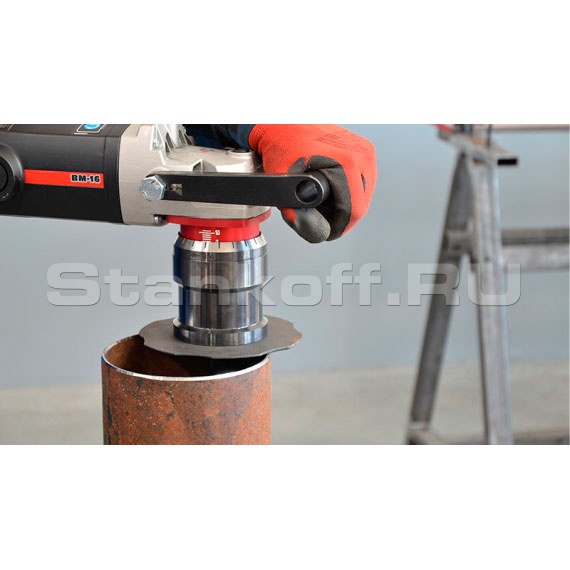 Возможно снятие внутренней фаски в отверстиях диаметром от 40 мм. В ВМ-16 реализована плавная регулировка ширины фаски, защита от перегрузки а также электронная регулировка частоты вращения головки для работы по различным видам материалов.