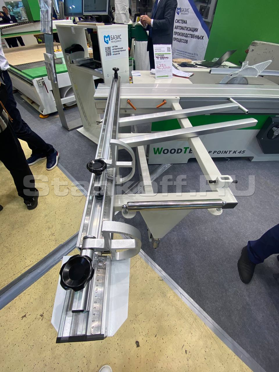 Поперечная линейка - телескопическая, выполнена из качественного многогранного профиля, шкала спрятана внутри профиля, флажковые упоры имеют жесткую фиксацию. Сама линейка жестко крепиться к поддерживающему столу. Все это позволяет станку сохранять точно установленные размеры при работе и перенастройках.