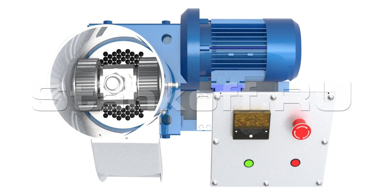 Конструктивная особенность грануляторов серии «Медведь» - неподвижная матрица и тройные подвижные ролики, что обеспечивает сильное прессующее давление и высокую производительность. Оборудование может быть укомплектовано дополнительно: пультом управления – для запуска и аварийной остановки, а также наблюдением за текущими значениями нагрузки на электродвигатель, шнеком дозатором (с частотным преобразователем) – для равномерной подачи сырья в бункер гранулятора.