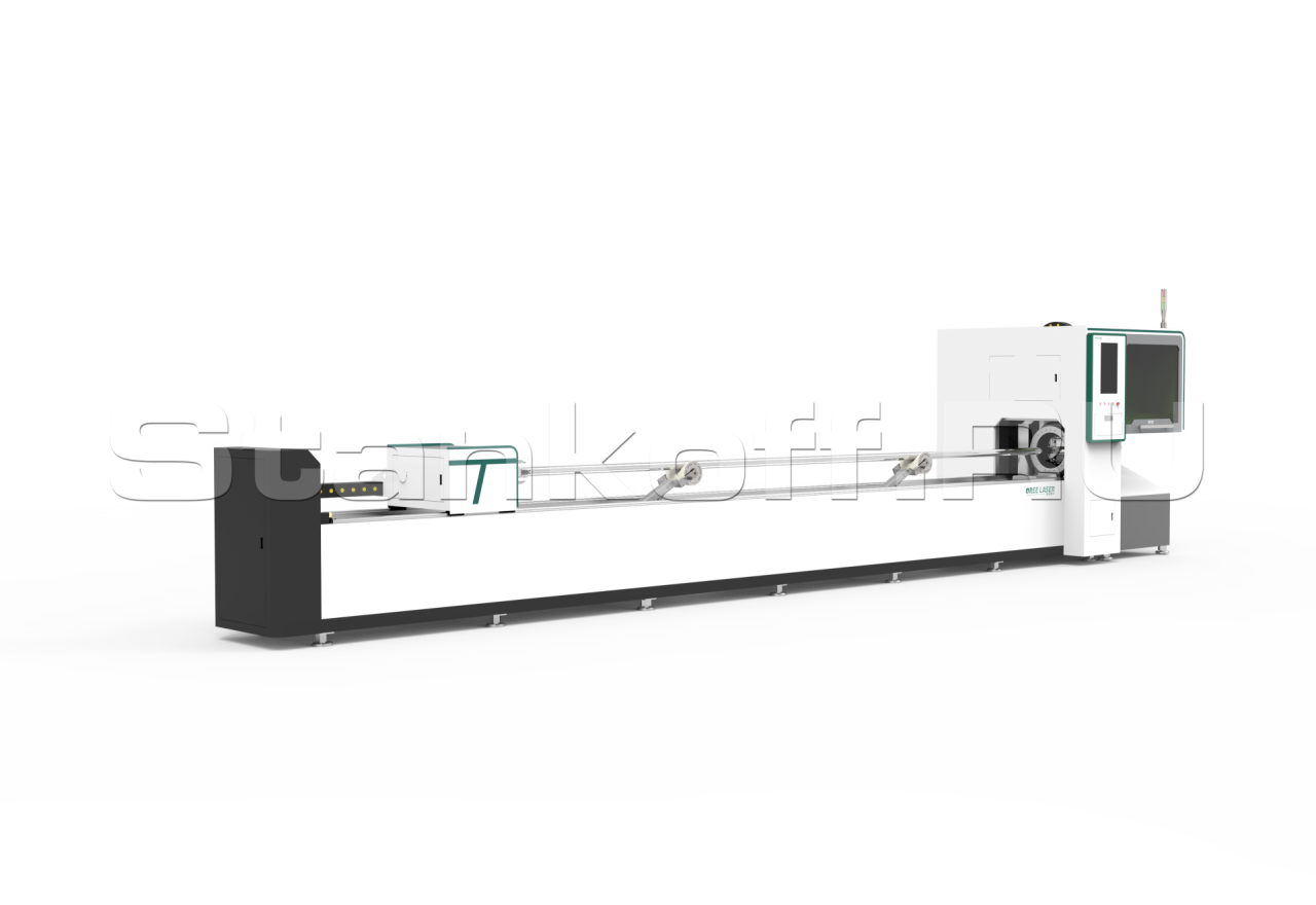 Современный станок для резки труб из нержавеющей, углеродистой, марганцевой стали, латуни, алюминия и т.д круглой, квадратной, эллиптической, шестигранной формы, D-образных труб, с оптоволоконным лазерным излучателем и электронной системой управления ЧПУ. Может обрабатывать трубы различных диаметров и длин. Широко используется в различных отраслях промышленности.