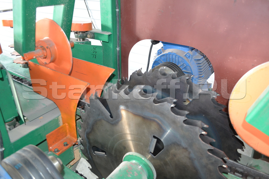 Обладает высокой производительностью за счет симметричной резки заготовок с двух сторон за один проход. Размер между пилами устанавливается вращением рукоятки со стороны оператора. Пилы расходятся и сходятся симметрично относительно продольной оси станка. Бревно укладывается по центру стола и обрезается сразу с двух сторон при подаче в пильный блок. Прижим заготовки обеспечивается прижимными дисками по центру - перед заходом в пильный блок и при выходе из него.