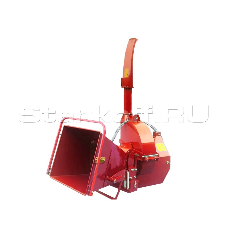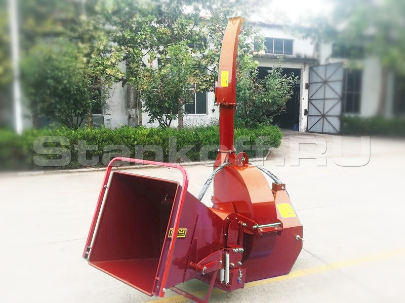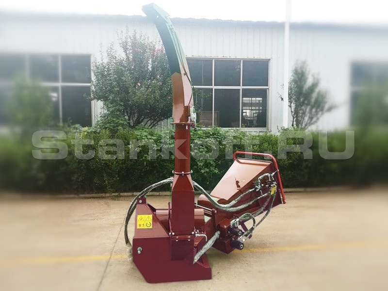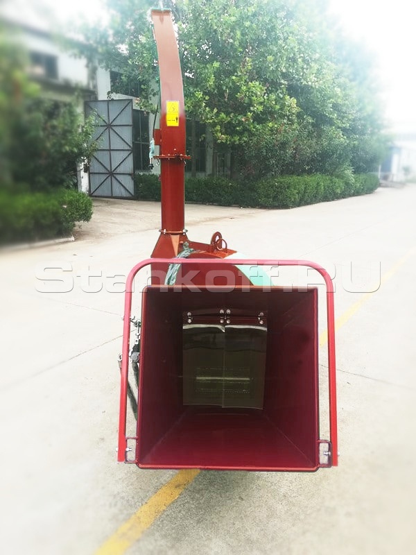 С гидроподачей от насоса измельчителя, скорость втягивания регулируемая, переработает ветки дерева до 230 мм диаметром в технологическую щепу.