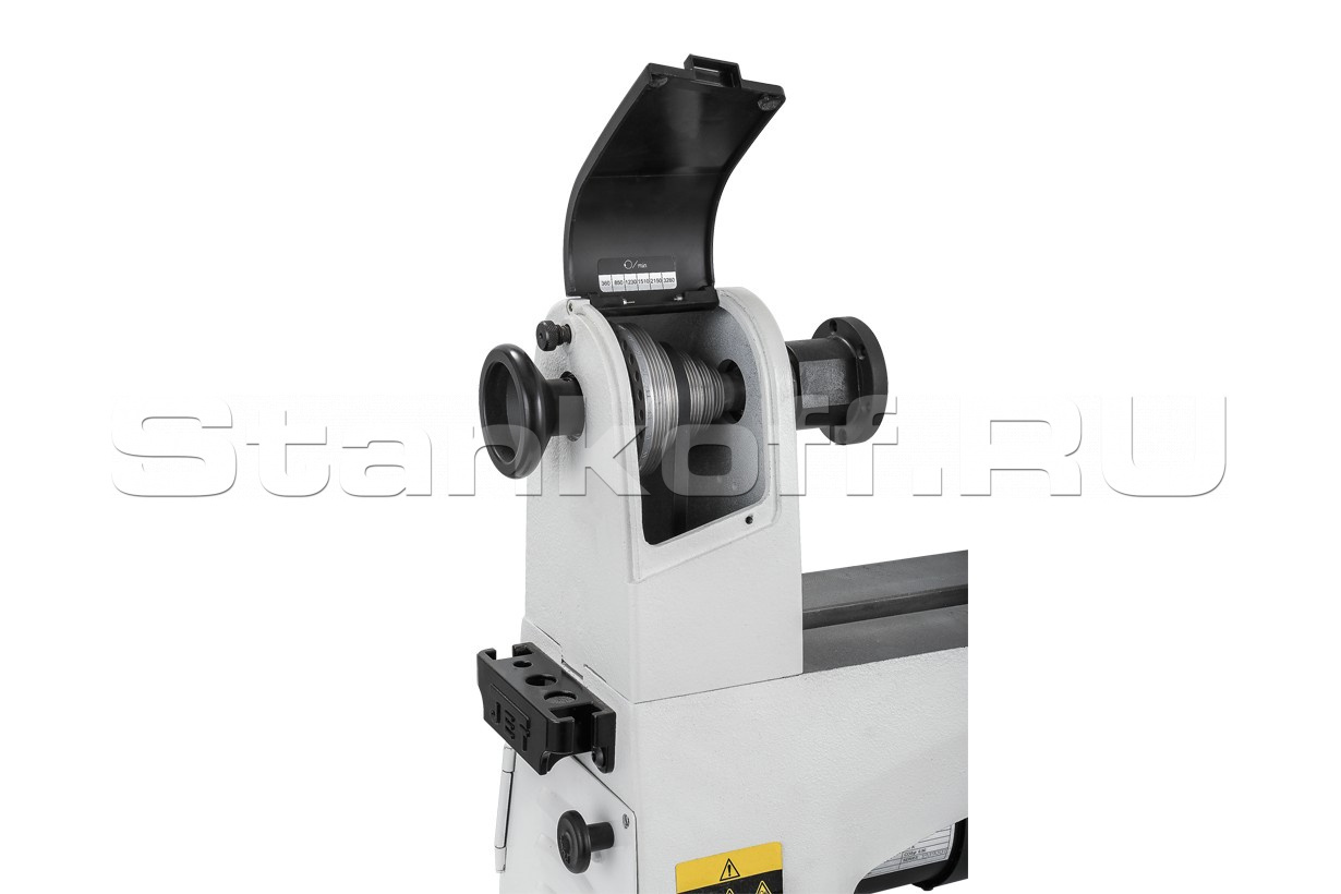Станок имеет мощную широкую станину, в чем его основное отличие от моделей предыдущей серии. Тяжелое и жесткое основание обеспечивает точную и комфортную работу без вибраций и биений. Шпиндель установлен на усиленных подшипниках и приводится во вращение от асинхронного двигателя через поликлиновый ремень. Для выбора передаточного отношения есть шесть пар шкивов. Переустановка ремня, его натяжение и ослабление производятся храповым рычажным механизмом без использования вспомогательного инструмента. Есть делительное приспособление на 24 позиции.