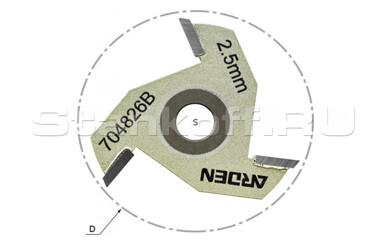 Пазовая дисковая фреза с тремя напайными твёрдосплавными зубьями и фаской 45% на посадочном отверстии для установки на державки ARDEN и крепления на них гайкой. Имеет защитное покрытие золотистого цвета. Используются, как сменные режущие элементы пазовых фрез для продольных канавок.