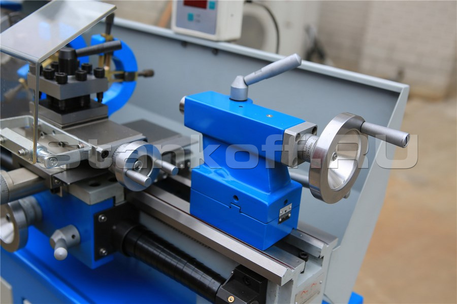Защита ходового винта на всей длине. Четырехпозиционный резцедержатель под инструмент сечением 12 х 12 мм. Функция поворота верхних салазок для точения конуса