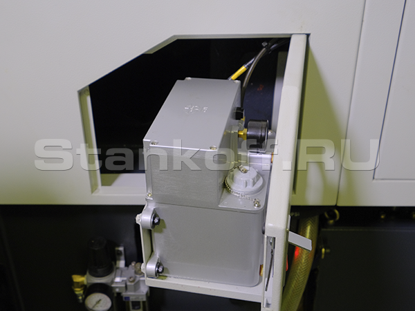 Автоматическая система обеспечивает централизованную своевременную смазку по основным движущимся элементам – ШВП, направляющим, подшипникам, что сокращает в разы их износ. Установка времени впрыска осуществляется через контроллер панели ЧПУ. Система смазки компактно встроена в корпус станка. Оповещение на панели оператора об минимальном уровне или окончании масла в резервуаре.
