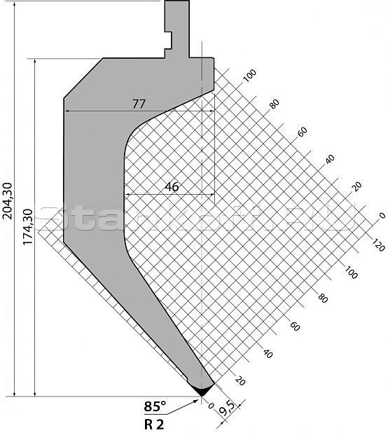 Пуансон гусевидного типа. Предназначен преимущественно для гибки деталей с длинными полками из различных вариантов толщин листового металла. Изготовлен из высококачественной легированной стали 42Cr:900-1150 N/mm².
