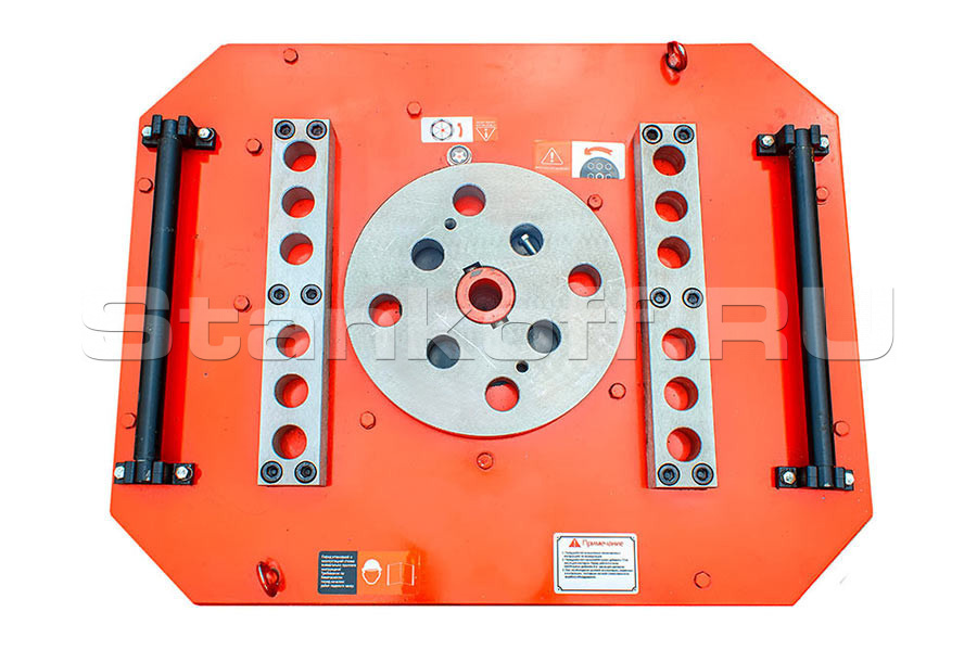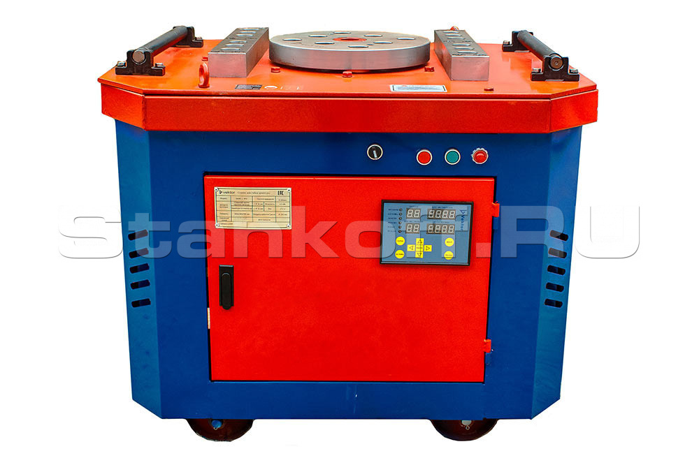 Станок данной модели производит загиб посредством вращения диска с механическим приводом. Управление станком осуществляется электрической системой автоматизации. Такая система позволяет выполнять все необходимые в строительстве углы загибания арматурной стали с максимальной точностью. Загибочный диск вращается в направлении по часовой и против часовой стрелки и работает как в автоматическом, так и в ручном режимах. Для выполнения нестандартных загибов можно использовать различные насадки и аппараты.