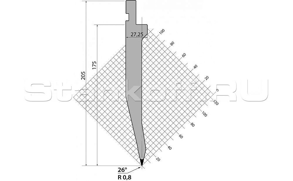 Пуансон прямого типа. Предназначен преимущественно для гибки деталей с длинными полками из различных вариантов толщин листового металла. Изготовлен из высококачественной легированной стали 42Cr:900-1150 N/mm².