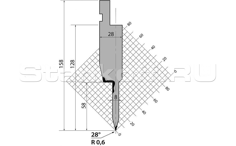 Н (высота), 158 мм. Радиус гиба, 0.6 мм. Градус гиба, 28. Тоннаж, 800. Материал, 42Cr:900-1150 N/mm².