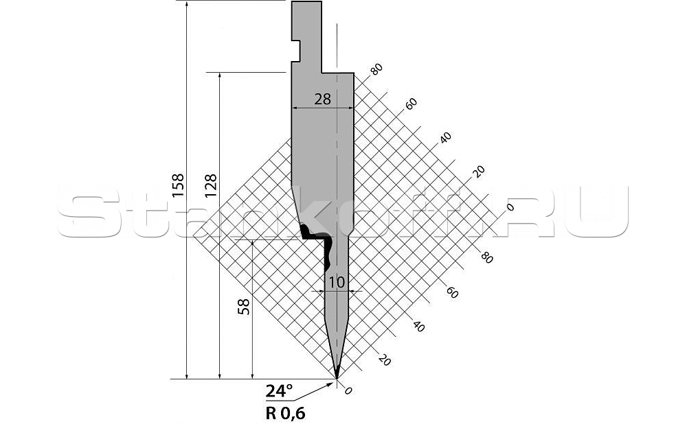 Н (высота), 158 мм. Радиус гиба, 0.6 мм. Градус гиба, 24. Тоннаж, 800. Материал, 42Cr:900-1150 N/mm².