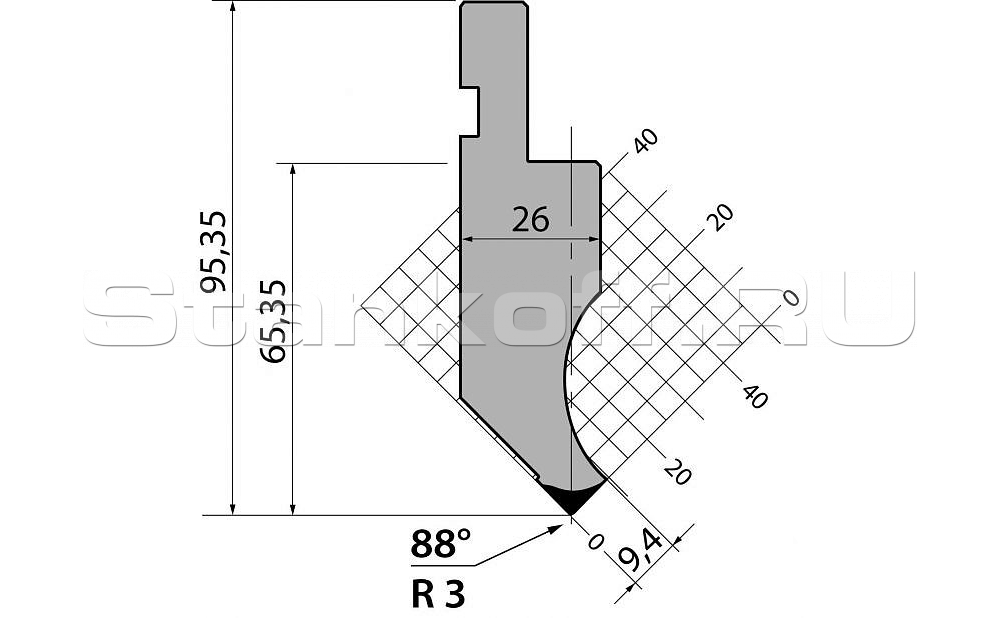 Пуансон прямого типа. Предназначен преимущественно для гибки деталей с маленькими и средними полками из различных вариантов толщин листового металла. Изготовлен из качественной конструкционной стали C45:560-710 N/mm².