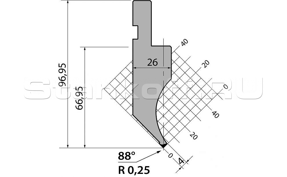 Пуансон прямого типа. Предназначен преимущественно для гибки деталей с маленькими и средними полками из различных вариантов толщин листового металла. Изготовлен из качественной конструкционной стали 42Cr:900-1150 N/mm².