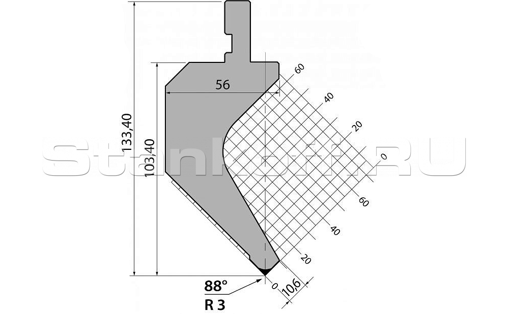 Пуансон гусевидного типа. Предназначен преимущественно для гибки деталей с большими и средними полками из различных вариантов толщин листового металла. Изготовлен из качественной конструкционной стали C45 (560-710 Н/мм2).