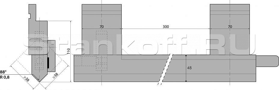 Н (высота), 140. Радиус гиба, 0.8. Градус гиба, 88. Тоннаж, 150. Материал, 42Cr:900-1150 N/mm².