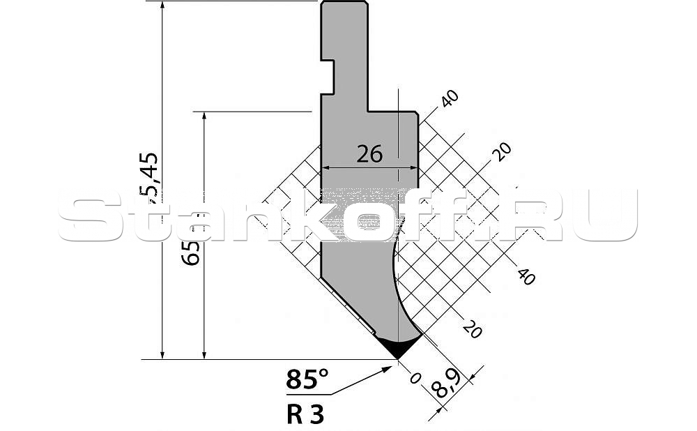 Н (высота), 95. Радиус гиба, 3. Градус гиба, 85. Тоннаж, 1000. Материал, C45:560-710 N/mm².
