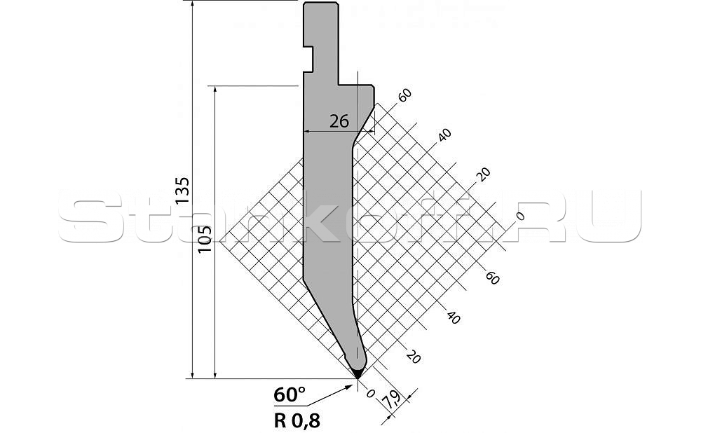 Н (высота), 135. Радиус гиба, 0.8. Градус гиба, 60. Тоннаж, 800. Материал, 42Cr:900-1150 N/mm².