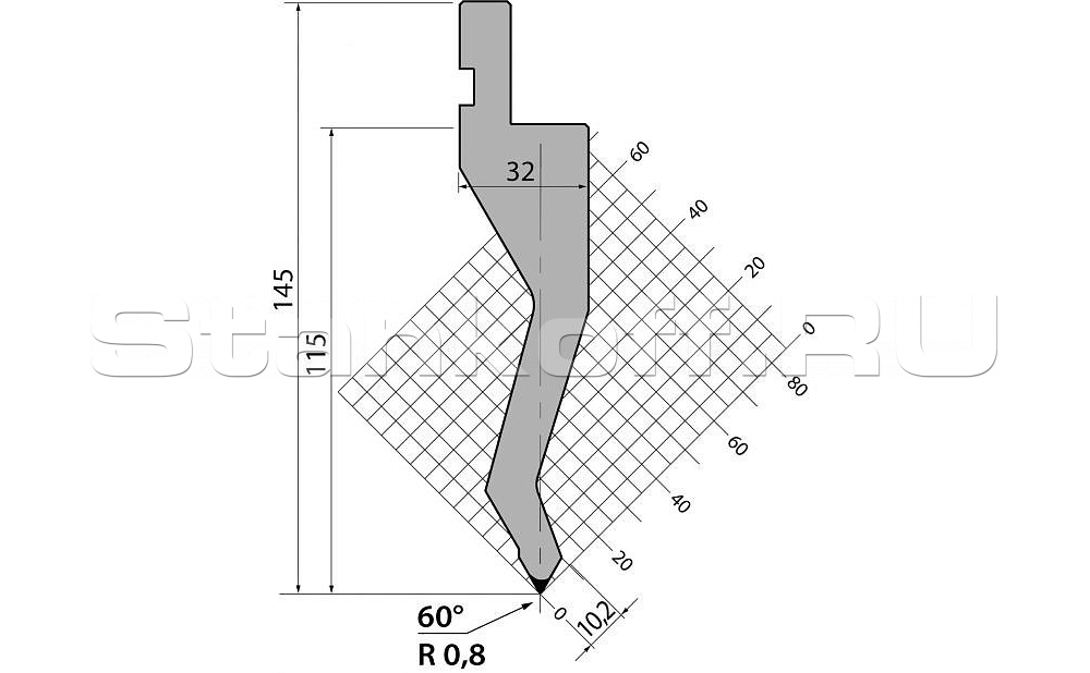 Н (высота), 145. Радиус гиба, 0.8. Градус гиба, 60. Тоннаж, 700. Материал, 42Cr:900-1150 N/mm².