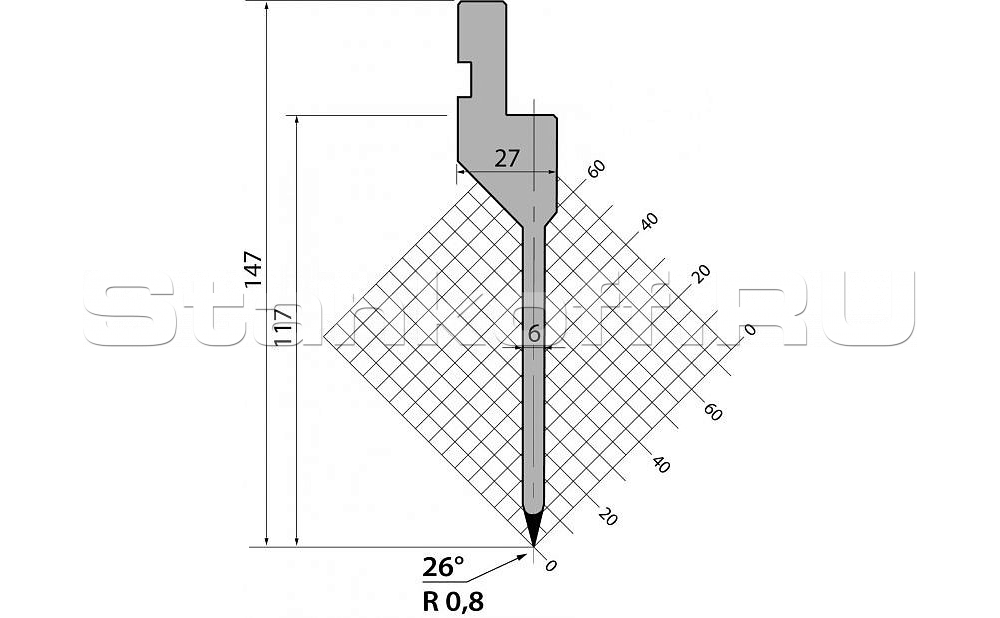 Н (высота), 147. Радиус гиба, 0.8. Градус гиба. 26. Тоннаж, 500. Материал, 42Cr:900-1150 N/mm².
