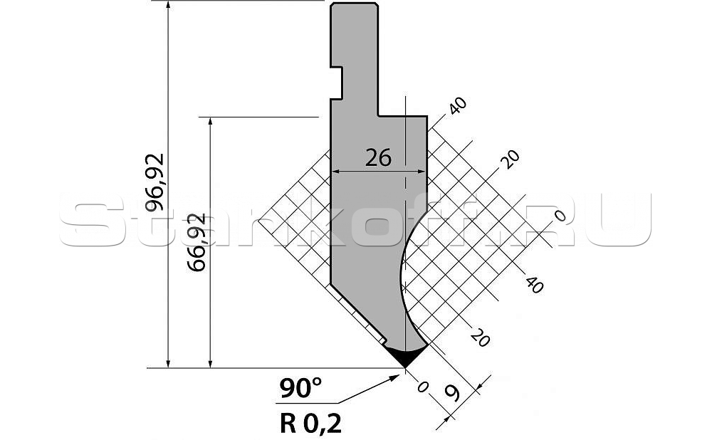 Н (высота) 97. Радиус гиба, 0.2. Градус гиба, 90. Тоннаж, 1000. Материал, C45:560-710 N/mm².