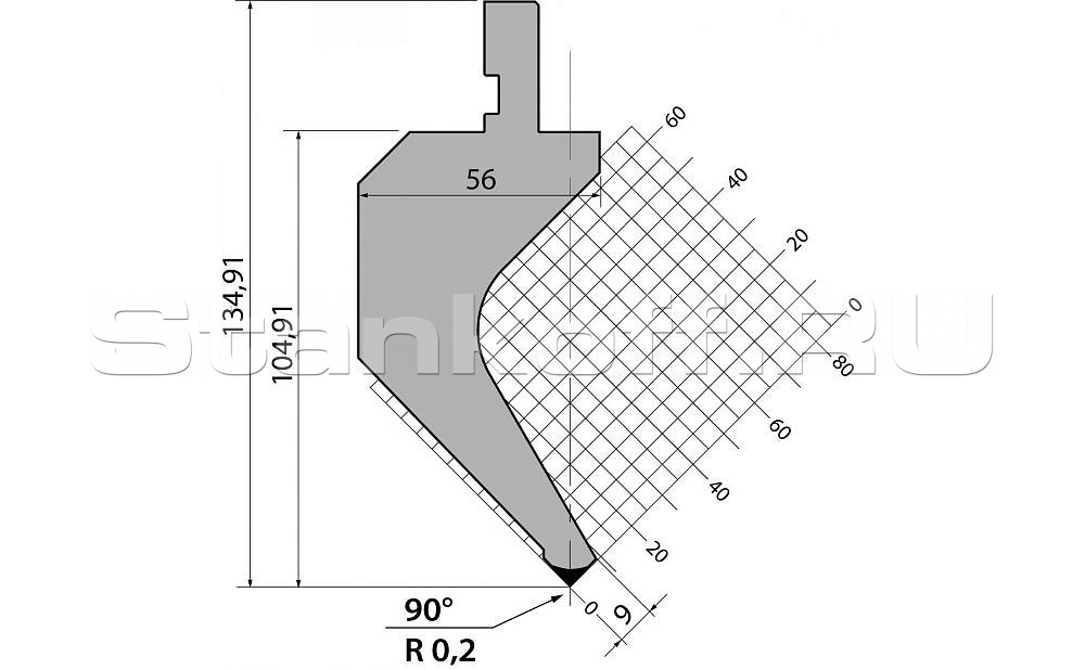 Н (высота), 135. Радиус гиба, 0.2. Градус гиба, 90. Тоннаж, 500. Материал, 42Cr:900-1150 N/mm².