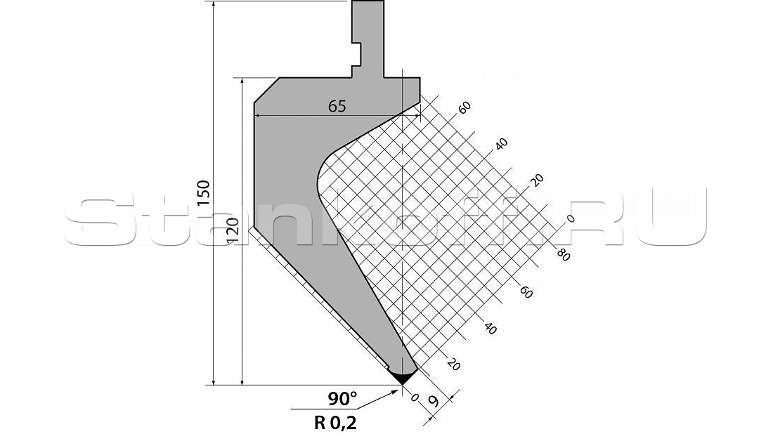 Н (высота), 150. Радиус гиба, 0.2. Градус гиба, 90. Тоннаж, 500. Материал, 42Cr:900-1150 N/mm².