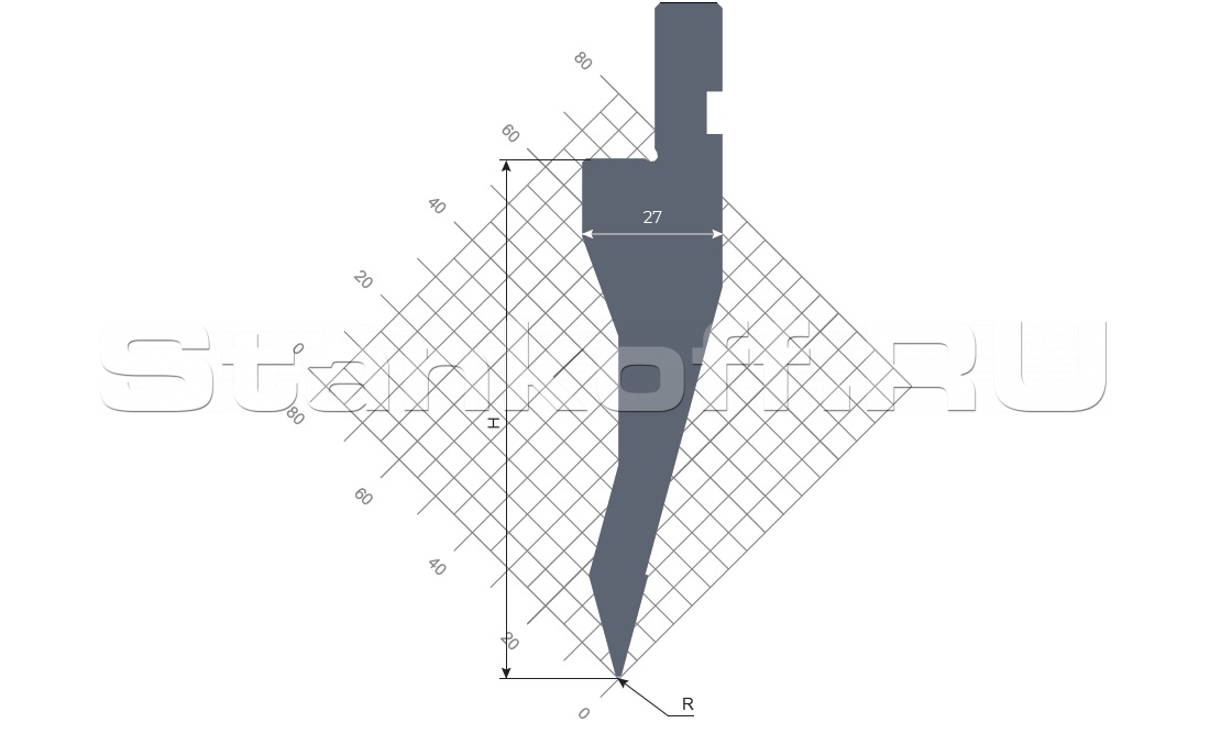 Угол, 30°. Радиус, 0,6 мм. Высота, 100 мм. Max нагрузка, 100 т/м. Материал, 42CrMo4.