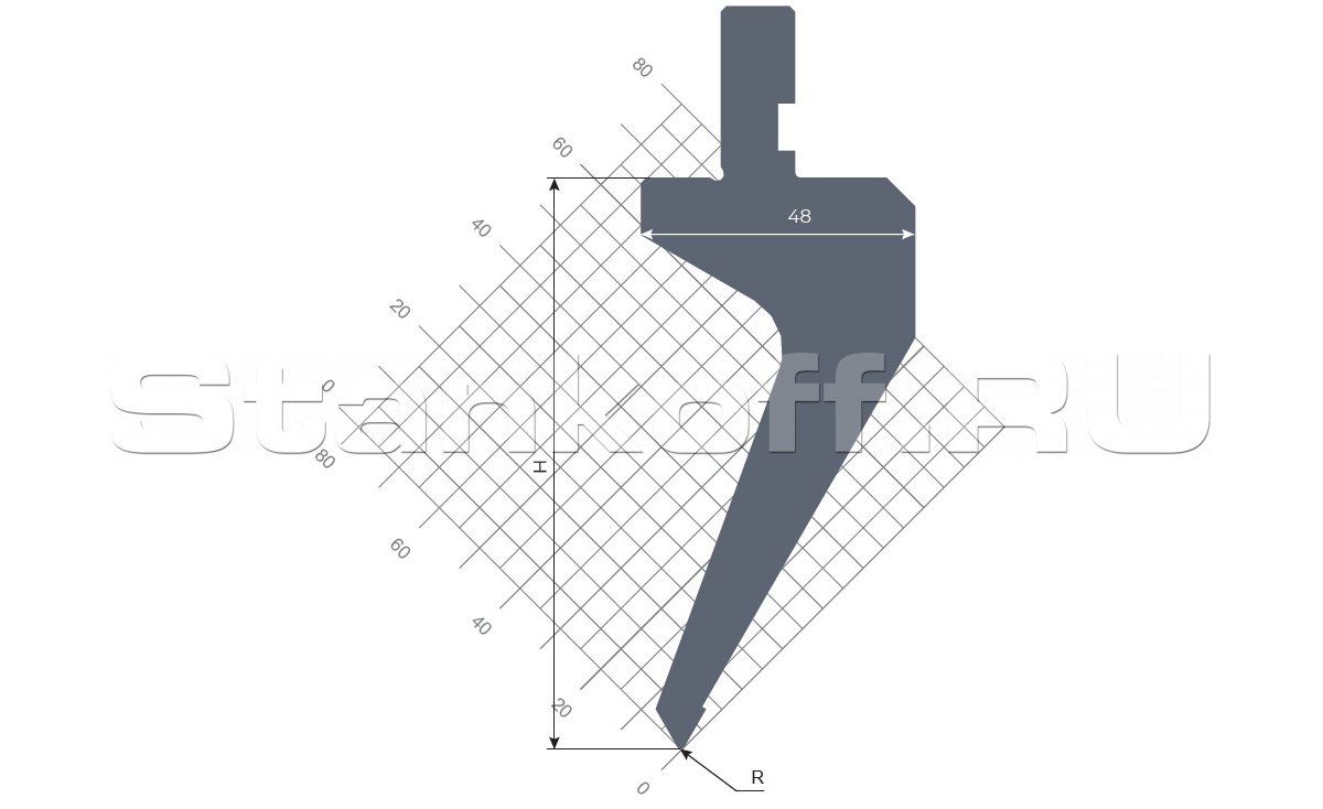 Угол, 60°. Радиус, 0,6 мм. Высота, 100 мм. Max нагрузка, 60 т/м. Материал, 42CrMo4.