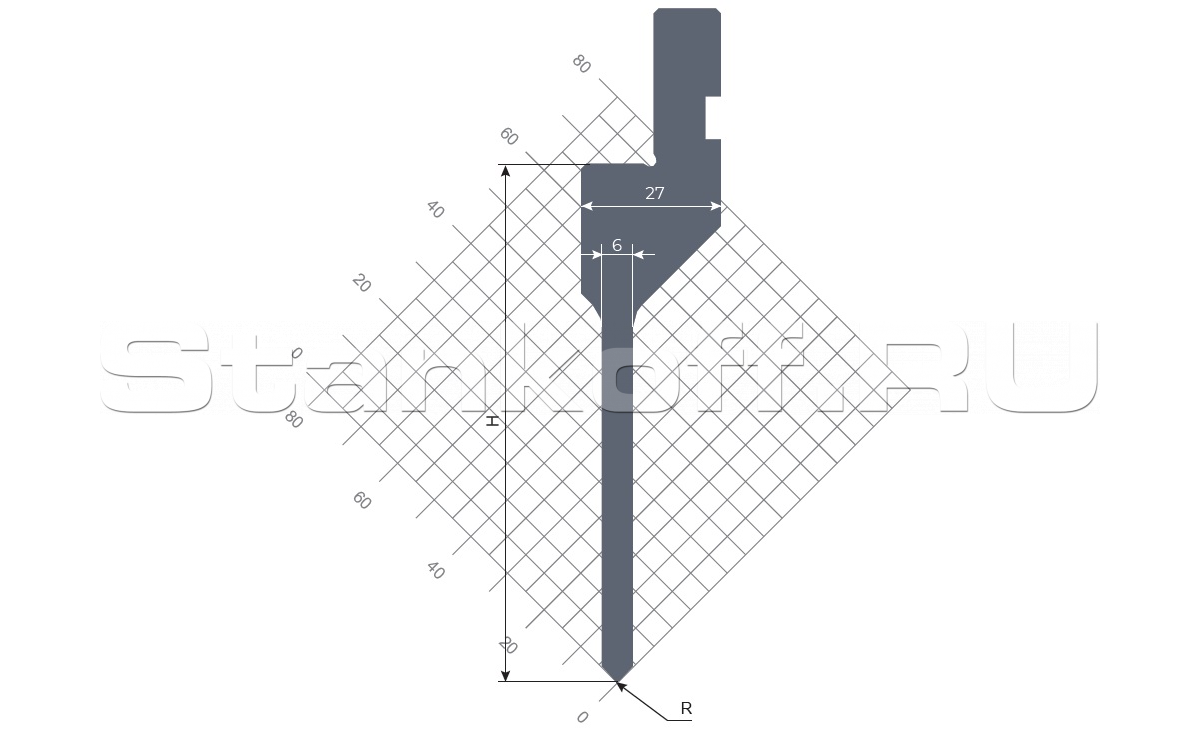 Угол, 85°. Радиус, 0,6 мм. Высота, 100 мм. Max нагрузка, 50 т/м. Материал, 42CrMo4.