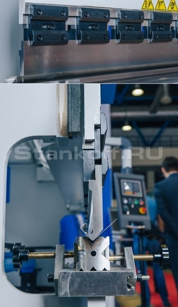 Станок укомплектован стандартным широкоуниверсальным комплектом гибочного инструмента (пуансон + матрица). Данный инструмент позволяет производить гибы с углами – от 90 и более градусов.Матрица V образная многоручьевая, для гиба разных толщин металла.