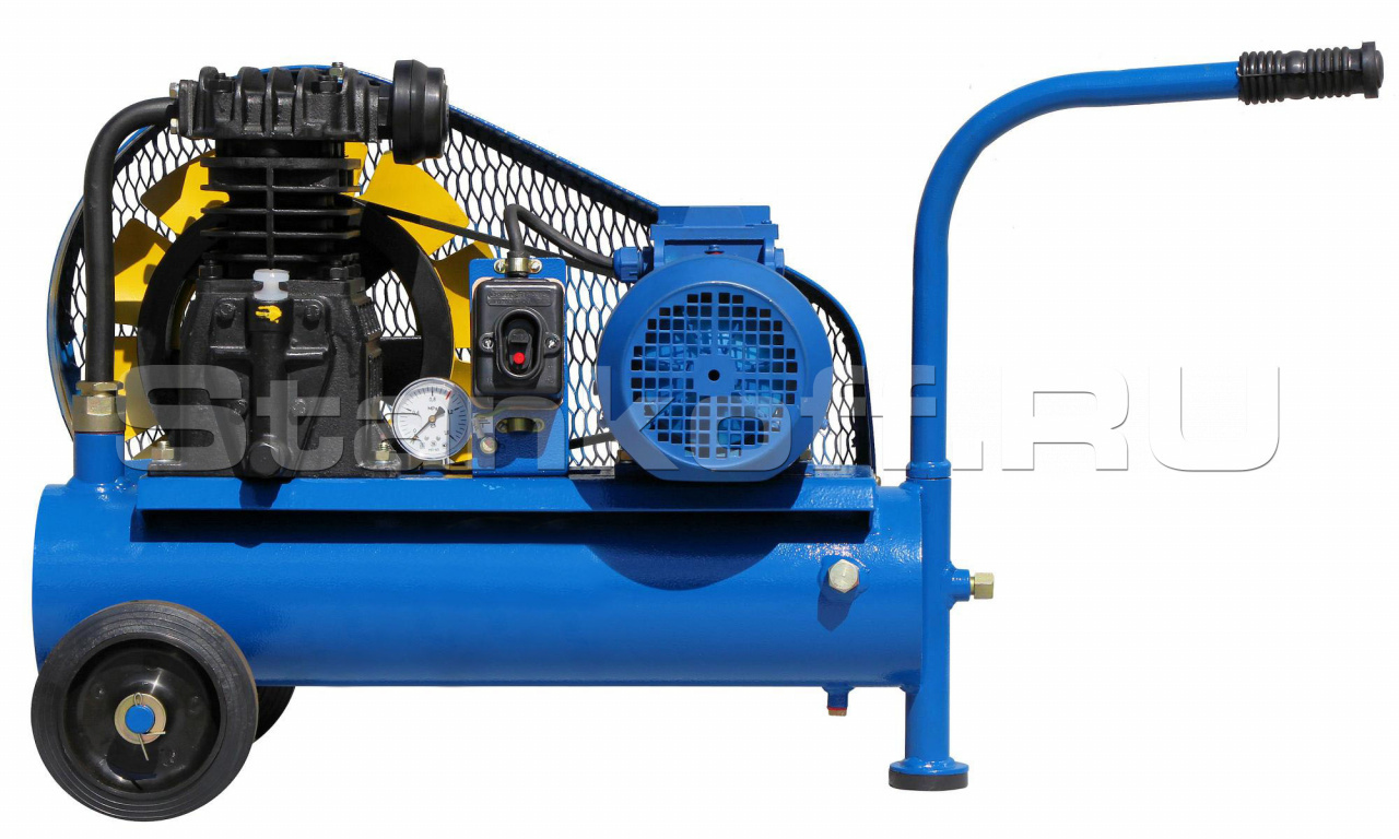 Компрессор С412М. Поршневой, масляный. Производит 250 л/мин на выходе при рабочим давлении 10 атмосфер. Поставляется на воздухосборнике 10 литров. Изготавливается в климатическом исполнении УХЛ 4.2. Компрессор оснащен колесами и ручкой для удобства перемещения. Реле давления на этой модели компрессора не устанавливается.