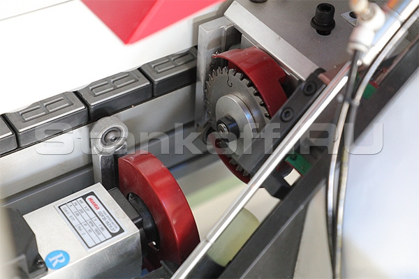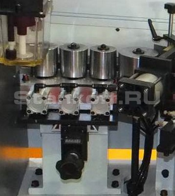 Оснащена главным прижимным роликом с приводом и тремя дожимными роликами позволяет прижать любую рулонную кромку и полосовой материал - рейку. С помощью цифрового счетчика регулируется ход прижима на толщину кромочного материала. Усилие пресс группы задается пневматически, что позволяет качественно приклеить кромочный материал к детали.