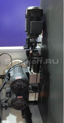 Оснащен двумя высокочастотными электродвигателями 0,37 кВт с универсальными фрезами, которые осуществляют обработку стыков кромки и придают изделию законченный вид. Минимальная длинна заготовки 250 мм (с высотой 18 мм).
