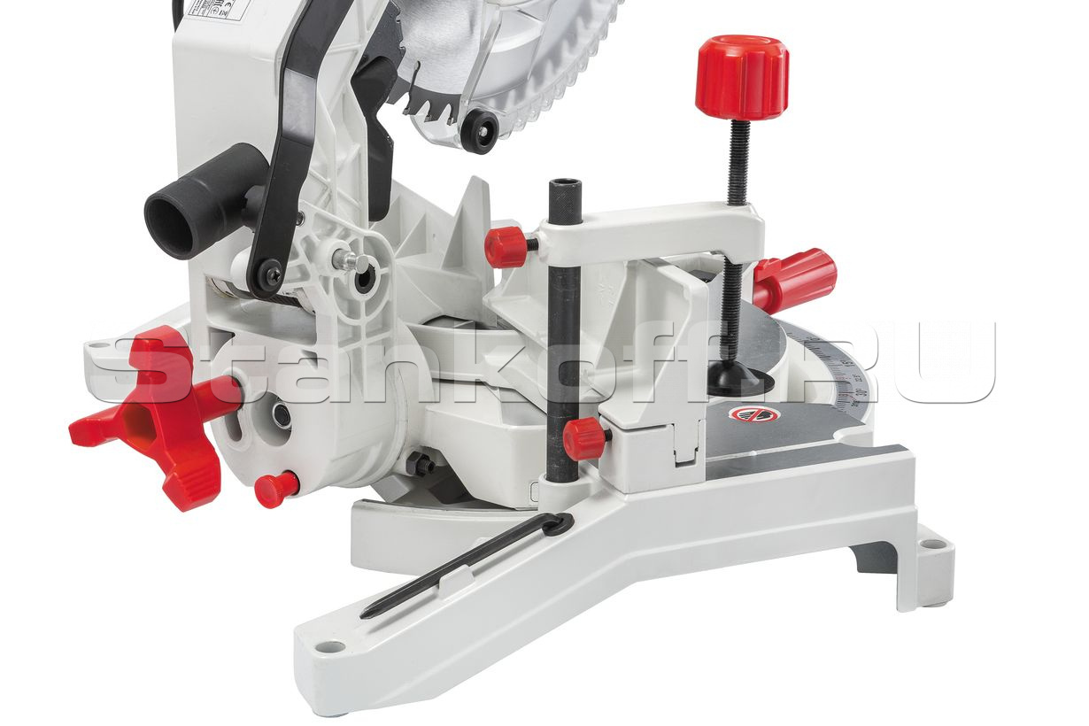 Станок укомплектован съемным винтовым прижимом заготовки, аспирационным патрубком и пылесборным мешком. Для облегчения замены диска предусмотрена кнопка блокировки шпинделя.