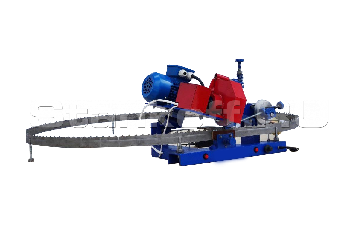 Станок укомплектован точильным камнем, положение которого по мере износа легко регулируется ослаблением болта или шайбами. Простая жесткая конструкция, удобное крепление тремя штангами в совокупности с отличным качеством заточки расширяет сферу его применения. Заточное устройство успешно используется в мебельном, деревообрабатывающем, лесопильном производстве, подходит частникам. Востребовано там, где есть ленточные пилорамы малой и средней мощности.
