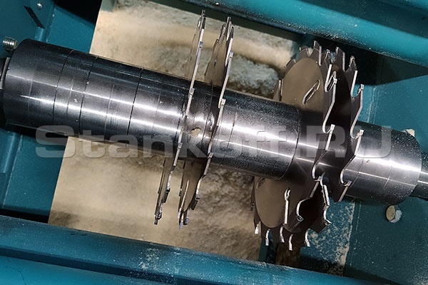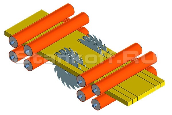 Кромкует необрезную доску на несколько размеров одновременно. Движется исходный пиломатериал, а пильный узел неподвижен. Улучшенная система подачи не оставляет следов на поверхности заготовки. Можно использовать до 6 пил на одном валу. Для работы используются пильные диски 250 мм. Размеры выставляются с помощью проставочных шайб. Другие размеры проставочных шайб можно заказать дополнительно. Рекомендуем использовать роликовые столы и лазерные линейки МЛК-10.