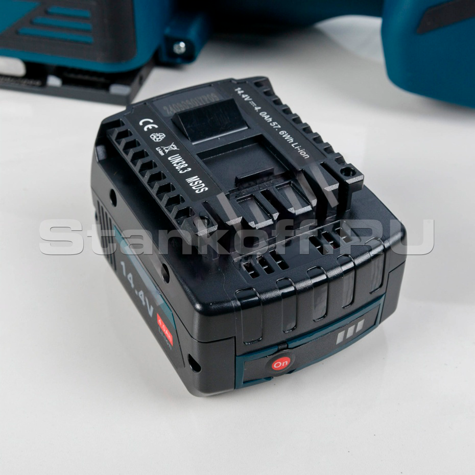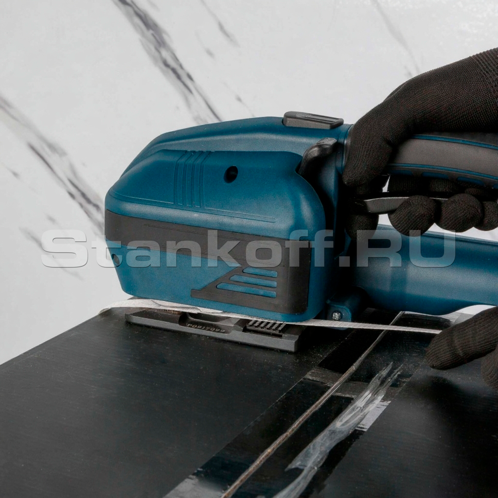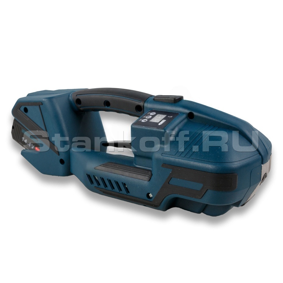 Питание — от литиевого аккумулятора 14,4 В, 4,0 А·ч (аккумулятор и зарядное устройство входят в комплект). Одного заряда хватает примерно на до 600 циклов обвязки, что удобно для интенсивной упаковки на складе и в производстве.