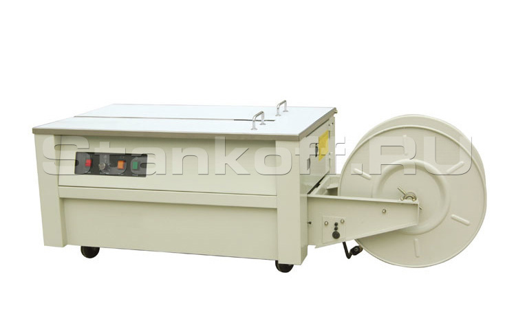 Конструкция обвязчика рассчитана для напольного использования и обвязки больших и тяжелых продуктов. Держатель рулона с лентой вынесен за пределы корпуса. Оператор помещает коробку на упаковочный стол, далее оборачивает продукт лентой и свободный конец ленты помещает в приемное устройство, далее обвязчик автоматически создаст заданное натяжение и сваривает ленту. При продолжительном простое аппарат автоматически отключается. Натяжение ленты возможно регулировать от 10-450 H.