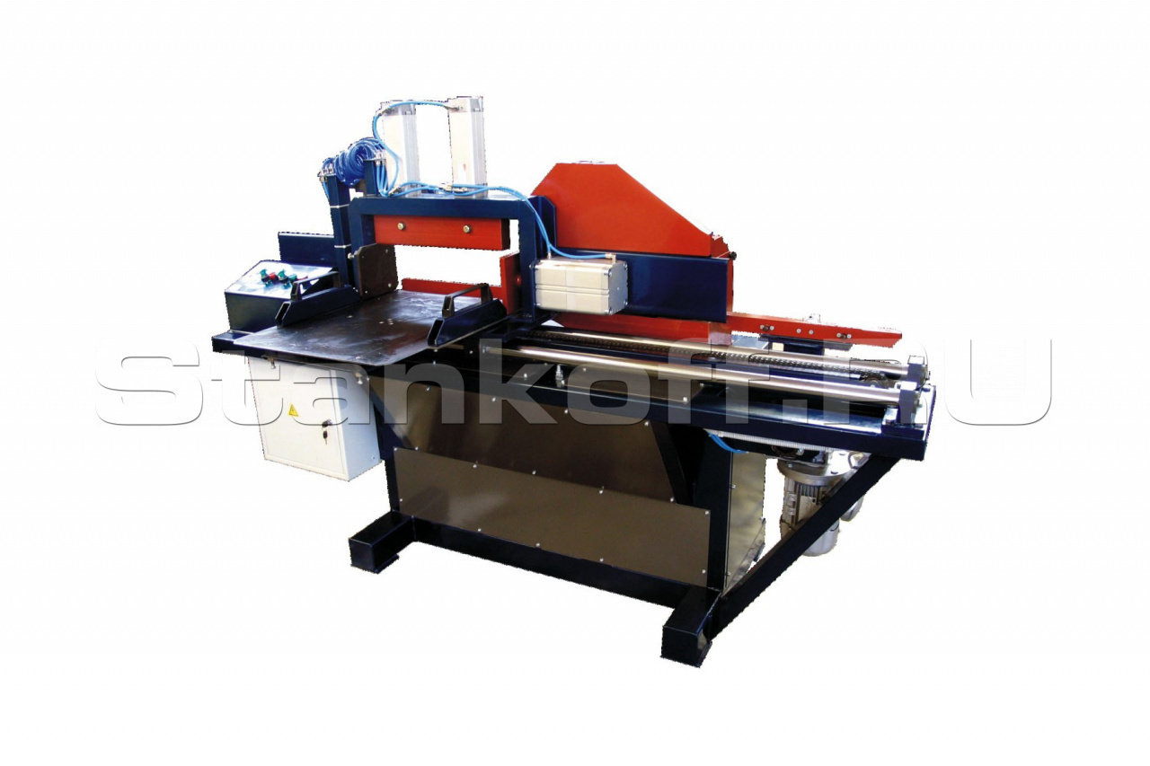 Станок предназначен для формирования (зарезки) зубчатого шипа на торце заготовки (деревянного бруса) для дальнейшего сращивания по длине. Особенностью станка является работа с поворотным столом с одновременным смещением на половину шага. Верхний и боковой поджим заготовки, а также перемещение каретки осуществляется пневматикой Camozzi (Италия), FESTO (Германия), SMС (Япония). Механический привод шипорезной каретки. Перед обратным ходом каретки, пакет заготовок автоматически отодвигается пушером, исключая повторную подрезку шипа на обратном ходе.