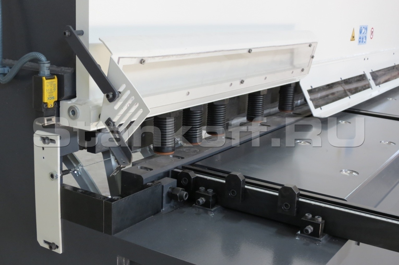 В момент реза лист фиксируется специальными прижимами. Для безопасности оператора на станке предусмотрено ограждение рабочей зоны станка. Передние поддержки и вмонтированные шарики в столе помогают оператору перемещать лист.