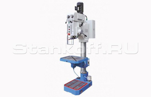 Возможна обработка деталей крупных габаритов благодаря откидному столу. Станок оснащен специальным узлом для контроля глубины сверления. Благодаря наличию механизма регулировки высота рабочего стола может изменяться. Имеется возможность поворота стола на необходимый угол вокруг цилиндрической колонны. Стол надежно фиксируется в требуемом положении. Электрооборудование станка встроено в колонну. Имеется система подачи охлаждающей жидкости с баком, встроенная в основание. Корпусные детали станка изготовлены из литого чугуна и сообщают конструкции высокую жесткость.