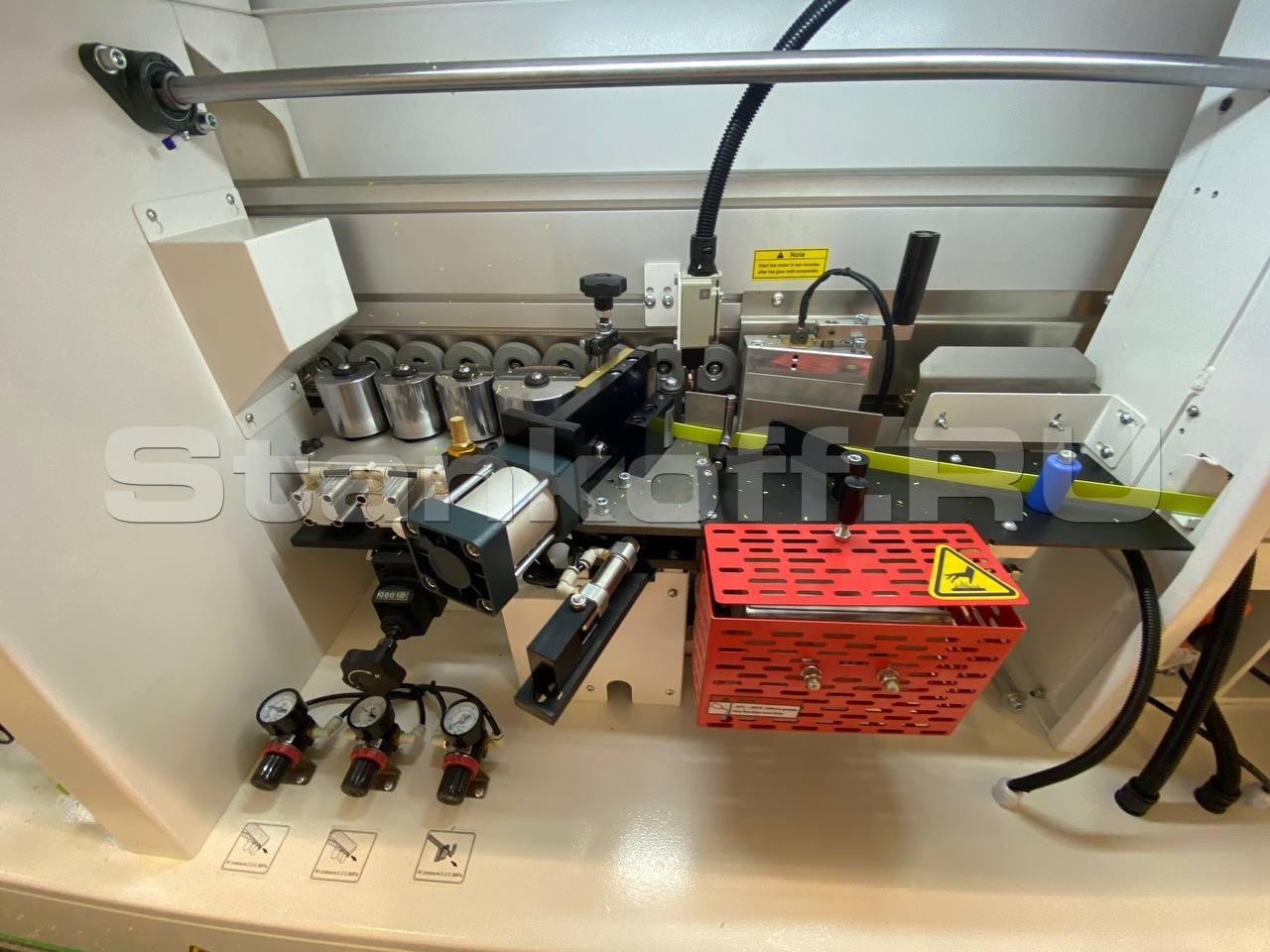 Состоит из одного ведущего ролика и трех до прессовочных роликов, которые обеспечивают надежную фиксацию кромочного материала на торец заготовки. На каждом ролике установлен отдельный пневмоцилиндр. 2 ролика из 4-х роликов имеют разный конус, что обеспечивает распределение усилия прижима по толщине детали. Давление на пресс группе задается с помощью пневматики, что гарантирует равномерное распределение усилий на кромку во время приклеивания.